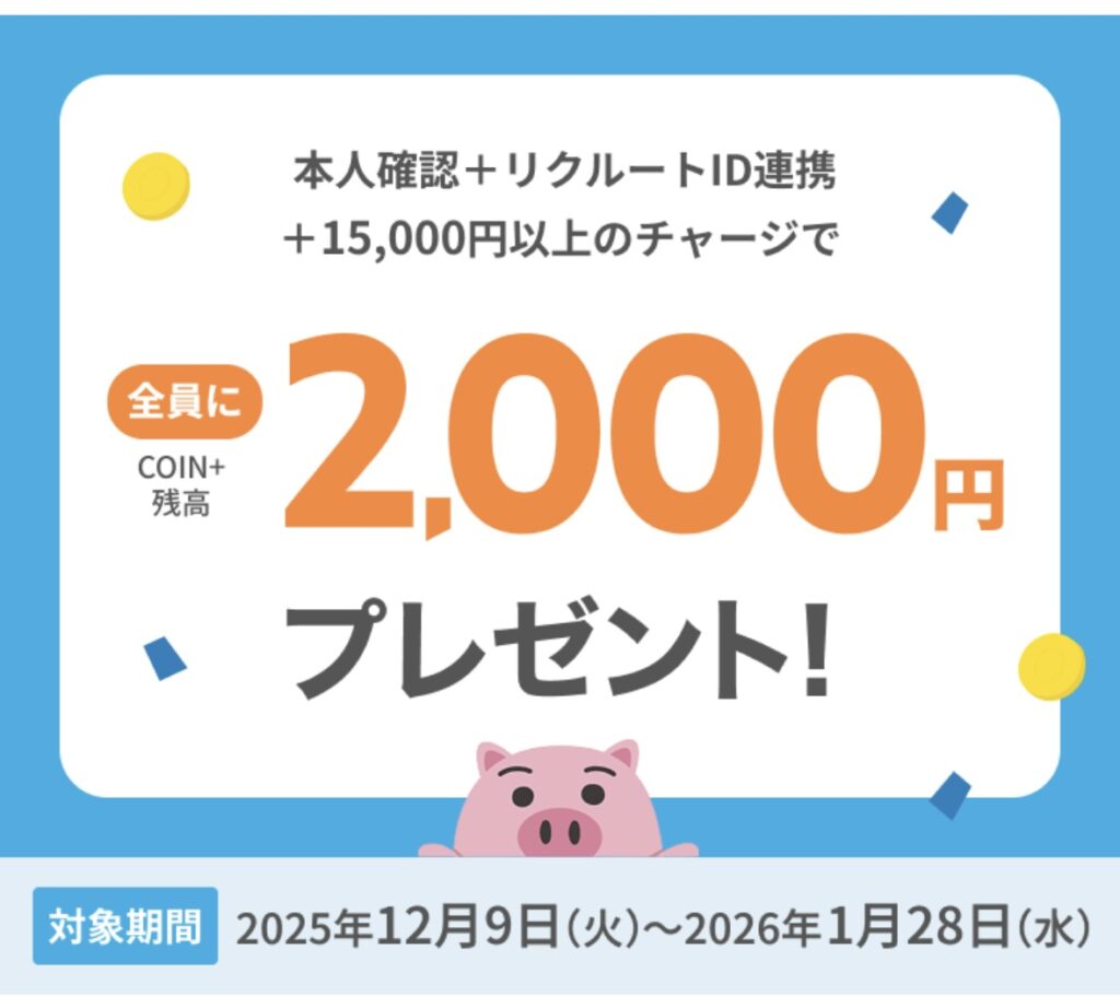 本人確認&リクルートID連携&15,000円以上チャージで2,000円